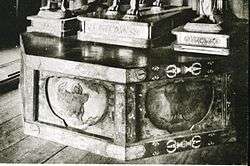 A well-known example is the pair of kalaviṅka carved in openwork (sukashibori) onto a Buddhist hanging ornament called the keman, used in the golden hall of Chūson-ji temple in Iwate Prefecture. The kalaviṅka from this ornament was commemorated on a 120-yen definitive stamp issued Nov. 1, 1962.[5] The pose and general appearance on this piece is similar to the ones seen on the octagonal pedestal of the same temple (pictured right).