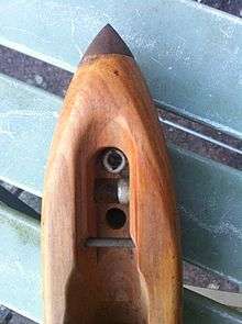 Shuttles were constructed from a dense heavy hardwood with metal tips. The wood was traditionally box. Imported timbers such as persimmon and cornel were also commonly used. The shuttle was shaped and hollowed using conventional wood working techniques, the metal tips are pressed onto the block. Strips of fox fur or similar were stuck to the inside of a shuttle to stop the thread ballooning as it left the pirn. There are many designs of shuttle. The Pemberton Loom needed a shuttle with a hinged shuttle-peg to hold the pirn; the later Draper loom shuttles clasped metal rings on the head of the pirn using a spring steel clip. The Draper Company claimed it had developed over 5000 different types of shuttle to meet "the needs of the mills and the whims of the weavers".[5][6]