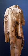 The kore Acropolis 674 is unique in its body structure: a long, thick neck and sloping shoulders contrast with head which is a little heavy. The facial expression is underlined by a new understatement in details of the hairstyle and clothing. The modelling of the face anticipates, at the turn of the century, the simplification which is found in the Kore of Euthydikos and in Classical sculpture.[2] The "Archaic smile" disappears with Acropolis 685, which has a similar structure but has an unusual pose: both hands were extended with offering and as a result her clothing is not gathered up and falls vertically, following the line of her body.[3] Ranuccio Bianchi Bandinelli attributes these korai to a single master whose stylistic fingerprint she also sees in the Kore of Euthydikos and the Blond Ephebe.