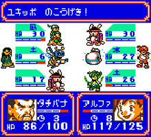 There are four options available in the battle menu; "Use kotodamas," "Kotodama history," "Defend," and "Escape." Items cannot directly be used by the player, and battles are fought out entirely through the use of kotodamas. Turns are determined by the "timecost" assigned to each type of kotodama or monster, and begin when the other side's timecost goes to zero. Kotodama battlers begin each battle with a timecost of 5, and monsters may have a timecost shorter or longer than that according to their type.