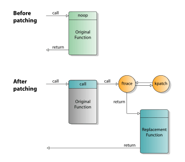 Internally, kpatch consists of two parts – the core kernel module executes the live patching mechanism by altering kernel's inner workings, while a set of userspace utilities prepares individual hot patch kernel modules from source diffs and manages their application. Live kernel patching is performed at the function level, meaning that kpatch can replace entire functions in the running kernel with their patched versions by using facilities provided by ftrace to "route around" old versions of functions; that way, hot patches can also easily be undone. No changes to the kernel's internal data structures are possible; however, security patches, which are one of the natural candidates to be used with kpatch, rarely contain changes to the kernel's data structures.[3][4][6]