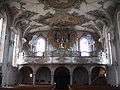The ceiling paintings by Franz Ludwig Herrmann show scenes from the monastic life of Saint Augustine of Hippo. The magnificent choir screen was made in 1737 by Johann Jakob Hoffner. The statues, larger than life-size, of Saints Ulrich and Afra were carved by Hans Christoph Schenk. Of particular interest is the Chapel of the Mount of Olives with a crucifix and a Calvary. The ceiling painting shows Moses with the brazen serpent and is also by Franz Ludwig Herrmann (1761). The representation of the Mount of Olives, made out of beechwood by Innozenz Beck, contains about 250 original statuettes, about 30 centimetres high, carved of Swiss stone pine wood ("Arvenholz") in about 1720-1730 somewhere in the south-eastern Alpine region.