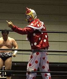 Akinori Tsukioka (月岡 明則 Tsukioka Akinori, born August 19, 1975) is a Japanese professional wrestler better known as Kuishinbo Kamen (くいしんぼう仮面 Kuishinbō Kamen), a masked clown character. Kuishinbo Kamen is Japanese for "Gluttonous Mask". For a while he was forced to give up the Kuishinbo Kamen character, instead he worked as "Super Robo K", a futuristic Robot character, but returned to the Kuishinbo Kamen identity later on.