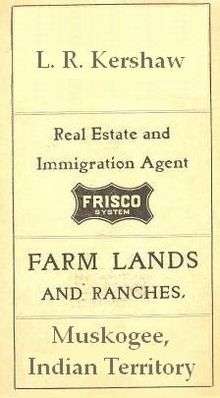Kershaw graduated from Elmwood, Illinois, High School and worked his way through college waiting tables, selling nursery stock and selling real estate. Kershaw graduated from the University of Illinois, Champaign-Urbana, Illinois, where he was a charter member of the honorary law fraternity, the Benjamin D. Magruder Chapter of Phi Alpha Delta in 1904. Professionally, he first became an Immigrant Agent for the St. Louis-San Francisco Railway, also known as the Frisco railroad, selling land to farmers for farms along the wide railroad right-of way in Northeastern Oklahoma. He bought many farms along the way, and in 1904 moved to Oklahoma himself. He was one of the founders of the Farmer's State Bank in Morris (in 1905) and the First National Bank of Morris (in 1908), (Indian Territory) Oklahoma. In 1910 he purchased the controlling interest in the National Bank of Okmulgee, Oklahoma. With the connections he had established with the railroad, he platted the town site of Morris, Oklahoma. The town of Morris was named after H. E. Morris,[2] a railroad executive with the Frisco railroad. The railroad went through the center of town, between Ft. Smith, Arkansas, and Tulsa, Oklahoma. The town of Morris was founded in 1904, before statehood. Oklahoma became a state in November 1907.