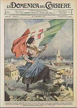A woman, representing Italy, celebrates the Italian victory over Austria-Hungary