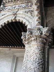 The cloister is noted for its mix of Baroque and Mudéjar elements,[1] and has been called one of the most beautiful monasteries built in Mexico because of its elaborate decoration.[1][2][4] In the middle is a patio, surrounded by two floors of columns with arches, behind which are walkways. A large staircase leads to the upper floor and tower next to the street. On each of the four sides of the patio, the seven ground-floor columns divide into fourteen upper-floor columns. The ground-floor columns are of Doric style and the keystones of each of the arches bear medallions with images of apostles or Mercedarian monks.[1] The columns of the upper floor, built later, have more decoration than the lower.[4] These columns are decorated with lattices intertwined with foliage and fruit.[1][2] The spaces between the pilasters are decorated in Baroque style, with sculpted images of Mercedarian monks in the triangles that extend from the arches to the ceiling.[2] On the undersides of the arches, small pyramids point downwards.[1][2]
