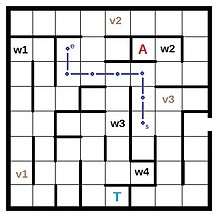 - Labyrinth can be populated with "creatures". An example - Bear. Bear moves around labyrinth either via some fixed trajectory or it simply repeats (when it can) other players' moves. If a player and Bear are in the same cell, the player is wounded. If Bear is wounded, it is immediately moved back to his Bear Cave (some cell pre-selected by the game master) and from there it starts its trajectory all over again. Other type of "creature" (much friendlier) is Leprechaun who when encountered will reaveal to the player the location (relative to player's current position) of the nearest Treasure - but it will not disclose the way of getting there. Leprechaun's trajectory is defined by some simple preset rules. Leprechaun can be killed