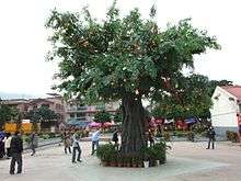On Feb 12, 2005, the fourth day of the Chinese New Year,[8] one of the branches was broken due to large amount of oranges and paper offerings were thrown onto the banyan tree.[9] The accident has injured a man aged 62 and a four-year-old boy.[9] Tree experts soon examined the structure and the condition of the wishing tree, concluding that all unhealthy branches would be removed, and wounds on the tree had been treated as to avoid infection.[8] As a result, the throwing of “Bao Die” was quickly prohibited by the government after the incident,[8] meanwhile reinforcing the wishing tradition by letting people hang the offerings on a wooden frame placed next to the original banyan tree.[8][10] Due to the lack of attractiveness of the attraction, A new plastic tree from Guangzhou was perchased in late 2009, plastic mandarin oranges are now only allowed to be tied to the branches.[11][12][13] The tradition was able to continue since then.