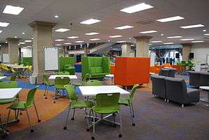 Learning commons, also known as scholars' commons, information commons or digital commons, are learning spaces, similar to libraries and classrooms that share space for information technology, remote or online education, tutoring, collaboration, content creation, meetings and reading or study.[1][2] Learning commons are increasingly popular in academic and research libraries, and some public and school libraries have now adopted the model.[3] Architecture, furnishings and physical organization are particularly important to the character of a learning commons, as spaces are often designed to be rearranged by users according to their needs.