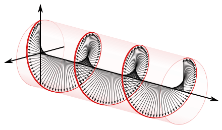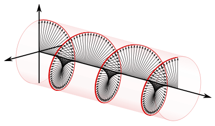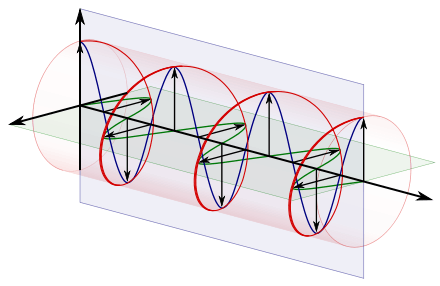 In electrodynamics the strength and direction of an electric field is defined by what is called an electric field vector. In the case of a circularly polarized wave, as seen in the accompanying animation, the tip of the electric field vector, at a given point in space, describes a circle as time progresses. If the wave is frozen in time, the electric field vector of the wave describes a helix along the direction of propagation.