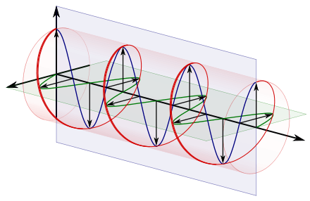 On the right is an illustration of the electric field vectors of a circularly polarized electromagnetic wave.[1] The electric field vectors have a constant magnitude but their direction changes in a rotary manner. Given that this is a plane wave, each vector represents the magnitude and direction of the electric field for an entire plane that is perpendicular to the axis. Specifically, given that this is a circularly polarized plane wave, these vectors indicate that the electric field, from plane to plane, has a constant strength while its direction steadily rotates. Refer to these two images in the plane wave article to better appreciate this. This light is considered to be right-hand, clockwise circularly polarized if viewed by the receiver. Since this is an electromagnetic wave each electric field vector has a corresponding, but not illustrated, magnetic field vector that is at a right angle to the electric field vector and proportional in magnitude to it. As a result, the magnetic field vectors would trace out a second helix if displayed.