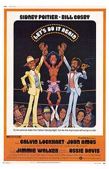 Let's Do It Again is a 1975 Action/crime film starring Sir Sidney Poitier, Bill Cosby and Jimmie Walker[2] plus an all star black cast. The film, directed by Poitier,[2] is about blue-collar workers who decide to rig a boxing match to raise money for their fraternal lodge. The song of the same name by The Staple Singers was featured as the opening and ending theme of the movie, and as a result, the two have become commonly associated with each other. This was the second film pairing of Poitier and Cosby following Uptown Saturday Night, and followed by A Piece of the Action (1977). Although their characters have different names in each film, the three Poitier-Cosby pictures are considered to be a trilogy. Of the three, Let's Do It Again has been the most successful both critically and commercially. Calvin Lockhart and Lee Chamberlin also appeared in Uptown Saturday Night.
