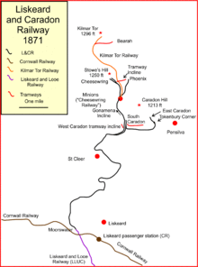Cooke gives milepost mileages for the line on adoption by the GWR (when the Gonamena incline had closed); from a zero at Looe the Moorswater point of junction was 7m 29c; South Caradon was 13m 66c. Tokenbury Corner (via reversal) was 14m 79c; Minions was 17m 16c; Cheesewring Quarry was 17m 67c; and Kilmar Tor was 19m 50c.[18] (Railway distances were measured in miles and chains; there are 80 chains in a mile. One mile = 1.61 km.)
