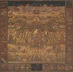 | Amida with Eight Great Bodhisattvas, gold and silver on purple silk 紫絹金銀泥絵阿弥陀八大菩薩像 shiken kingin doro-e Amida hachi-dai bosatsu zō | Goryeo | Tsuruga | Zenmyō-ji (善妙寺) | Goryeo Buddhist painting | | 155 centimetres (61 in) by 146 centimetres (57 in) | 35°39′13″N 136°04′19″E / 35.653631°N 136.071838°E | |