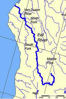 The Eel River begins near Bald Mountain, near Lake Pillsbury, and flows through that lake and flows north to the ocean near Rio Dell, where it spills into a river delta and an estuary. Along its course, it receives the Middle Fork at Dos Rios from the east, the North Fork also from the east, the South Fork at Weott from the southwest, and the Van Duzen River shortly downstream from the northeast. In total, the river drains about 3,684 square miles (9,540 km2). This list describes 37 crossings of the Eel.