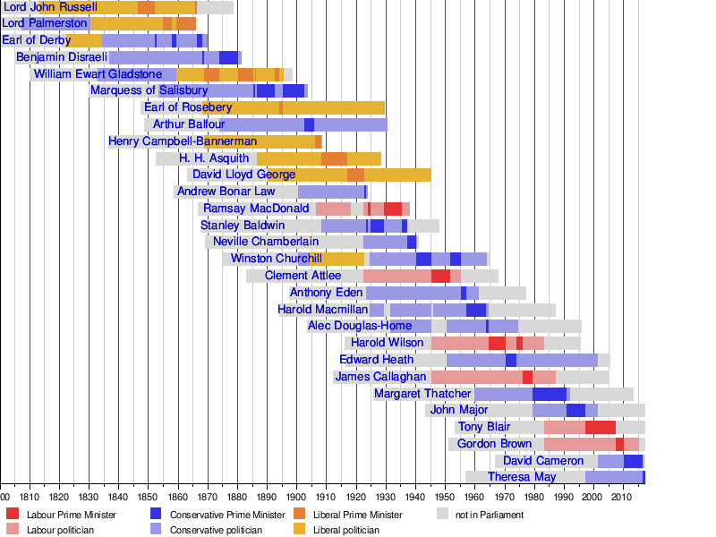 - A light colour denotes time spent in Parliament before or after serving as Prime Minister