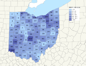 - ↑ The following sites are listed in multiple counties: Adams-Gray House (Coshocton and Muskingum), Brecksville-Northfield High Level Bridge (Cuyahoga and Summit), Dean Road Bridge (Erie and Lorain), Hocking Valley Railway Historic District (Athens and Hocking), Interurban Bridge (Lucas and Wood), Jaite Mill Historic District (Cuyahoga and Summit), Lockington Locks Historical Area (Miami and Shelby), Lynchburg Covered Bridge (Clinton and Highland), Miami and Erie Canal Deep Cut (Allen and Auglaize), Muskingum River Navigation Historic District (Coshocton, Morgan, Muskingum, and Washington), Ohio and Erie Canal (Cuyahoga and Summit), Seven Ranges Terminus (Carroll, Stark, and Tuscarawas), Station Road Bridge (Cuyahoga and Summit), and Valley Railway Historic District (Cuyahoga and Summit).