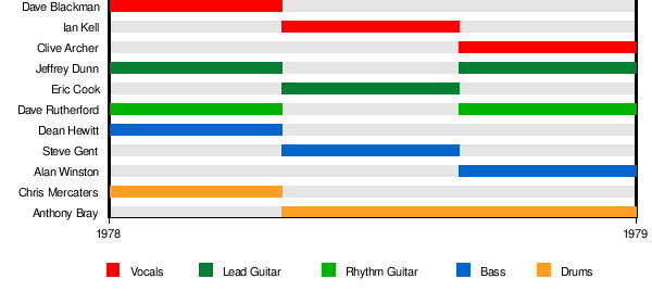 The following is a complete chronology of the various line-ups of British extreme metal band Venom, formed in 1979. The group evolved out of an older group, Guillotine, formed in 1978. No individual has consistently remained with the group throughout its entire career; vocalist and bassist Conrad Lant, a co-founding member, fronts the group today.