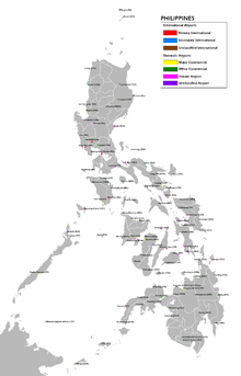 Airports of the Philippines (Note: privately owned airports with no IATA or ICAO codes are not included in the map).