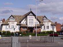 1908 | The library shows the influence of the Arts and Crafts movement. It is rendered on a sandstone plinth, apart from some exposed stone in the middle. The library has a slate roof. Its front is symmetrical, with a large central gable containing a window, and half-timbered gablets to the sides.[29] | II |