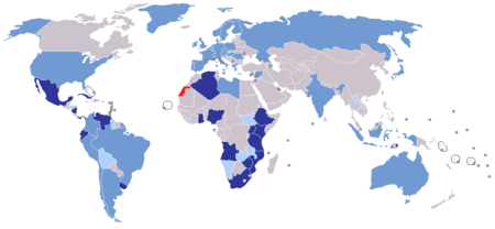 This is a list of diplomatic missions of the Sahrawi Arab Democratic Republic (SADR). The Sahrawi Arab Democratic Republic's government in exile, led by the Polisario Front and headquartered at Tindouf, Algeria, maintains diplomatic relations with 37 states, and has a small diplomatic network overseas. Due to Morocco's claim of sovereignty over the Western Sahara, which it calls the Southern Provinces, the SADR does not enjoy wide recognition. Most of the embassies of the SADR are in Africa and Latin America. Some embassies have multiple accreditation.[note 1] In addition, SADR (Polisario Front) maintains an extensive network of representatives in countries that do not recognise the SADR as a sovereign state.