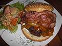 | Banquet burger | | A hamburger with bacon and cheese is a "banquet burger",[5] also known as a "bacon cheeseburger". Hamburgers with bacon but no cheese may be referred to as "bacon-burgers". | |