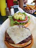 | California burger | | In portions of the Midwest and East coast, a hamburger served with lettuce, tomato, and onion is referred to as a "California burger." However, in the Western U.S., a "California" burger most often consists of a normal cheeseburger, with the addition of guacamole or avocado and bacon.[7] | |
