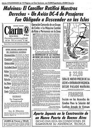 - 28 September 1966: 20 young Argentines from the extreme left-wing Cóndor group hijacked an airliner and forced the pilot to fly to Stanley, Falkland Islands. Some islanders were taken hostage.[1]