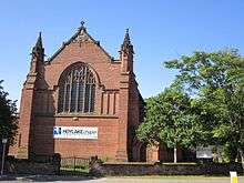 1865 | This church is built in polychromatic brick with some red sandstone dressings. Pevsner describes it as being "very ugly" while Hubbard describes it as being "experimental" and presenting "an astonishing sight". It is now a United Reformed church.[16][17] | II[18] |