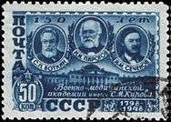19th-century Russian physicians Sergey Botkin, Nikolay Pirogov, and Ivan Sechenov on a 1948 stamp marking the 150th anniversary of the S.M. Kirov Military Medical Academy's founding.