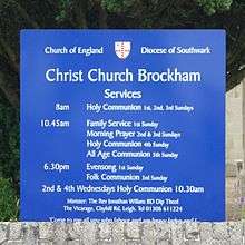 Crossways Community Baptist Church in Dorking is part of the Gatwick Network of the South Eastern Baptist Association, and Ashtead and Bookham Baptist Churches are within the association's Guildford Network.[57] Mount Zion Chapel, a Strict Baptist place of worship in Leatherhead, is affiliated with the Gospel Standard movement;[58] and Dorking Baptist Chapel (originally Strict Baptist) maintains links with GraceNet UK, an association of Reformed Evangelical Christian churches and organisations.[59][60][61] The Methodist congregations meeting in Leatherhead and in the shared Anglican and Methodist church in Dorking are covered by the eight-church Dorking & Horsham Methodist Circuit.[62][63] The Southern Synod, one of 13 synods of the United Reformed Church in the United Kingdom,[64] administers that denomination's churches at Dorking,[65] Great Bookham[66] and Leatherhead.[67] Disciples Church (Calvary Chapel Leatherhead) is a Bible-teaching, gospel-centred church that meets in the Leatherhead town centre.