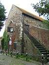 By the 19th century, few villages lacked an Anglican church, and attention turned to restoring and reconstructing ancient buildings—although places such as Hurst Green,[12] Netherfield,[13] Staplecross[14] and Telham[15] did receive churches of their own, often built as chapels of ease to distant parish churches. Some ancient churches still retain most of their medieval fabric and appearance, but churches such as Dallington,[16] Northiam[17] and Sedlescombe[18] were so comprehensively rebuilt in the mid-19th century that they now have a largely Victorian appearance. (Wholesale restoration of churches in the then-fashionable Gothic Revival style was a common and much criticised practice during the Victorian era.)[19] In the 20th century, Anglican churches continued to be provided as residential development spread along the English Channel coast east of Hastings. Building styles varied: at Winchelsea Beach, old-fashioned brick, timber and tile-hanging were used in 1962;[20] at Fairlight Cove, a square wooden box-like structure, intended to be both temporary and portable, has stood since 1970;[21] in Camber, the 1956 replacement for a bombed-out chapel of ease is in an old-fashioned early-20th-century style;[22][23] and at Cliff End on Pett Level an unusual building was purchased and reused. The Admiralty installed a Lifesaving Rocket Apparatus Station on the beach; in 1935 it was converted into the tiny St Nicholas' Church.[24]