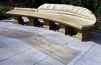 The Keats and Lamb bench. Hillhouse Edge sandstone seat with a quill pen back. The paving in the shape of an open book incorporates quotes from the poet John Keats and the writer Charles Lamb who both lived near to this site. Seat 825 x 3500 x 600 mm, floor panels 600 x 1650 each. | Church Street, Edmonton, North London. Junction with Winchester Road. | 1999 | Tim Shutter | The artist. | 51.626100 N