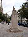 Unveiled 11 November 1922 (Armistice Day) by Viscount Churchill.[19] The figure of a soldier stands reading a letter from home in front of a panel of black marble, suggesting the entrance to a trench dugout.[20] |