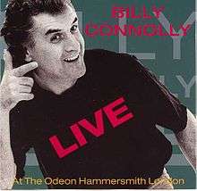 Live at the Odeon Hammersmith London is the title of a 1991 comedy album release and a videotaped performance by Billy Connolly. It was recorded and filmed during several of Connolly's performances at the Odeon Hammersmith theatre in London, England, in June 1991 and released in the fall of that year. The album was released by Virgin Records and produced by Stuart Epps.