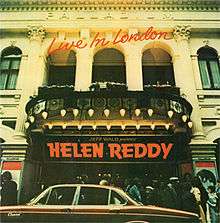 Live in London is a live album by Australian-American pop singer Helen Reddy that was released in 1978 by Capitol Records and, as with her previous release, did not reach Billboard magazine's Top LP's & Tapes chart.[3] In addition to live recordings of several of her hits, the two-LP concert album includes her renditions of two songs that have never appeared on any of her other studio releases: the show's opener, "Rhythm Rhapsody", and Billy Joel's "The Entertainer". On June 25, 2002, the album was released for the first time on compact disc.[4]
