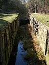 The 1828 design originally filled the lock chamber through the use of culverts in the lock masonry. The wicket, i.e. large paddle valve, hidden in the masonry recess where the upper gate fit in, would be opened, and water would flow through the lock masonry to three openings in the lock chamber. Both sides of the lock had these, so there would be a total of 2 wickets, and 6 openings. The upper gate is above the breast wall.[24][25] Most of the wicket openings in the upper gate recess have been closed with masonry, but one wicket at Violettes Lock is still intact as of 2013 (see photo). Note that modern replacement gates in locks 1-23, have the wickets in the gates, since the original wickets in the lock masonry are inoperable. This system of routing water through the masonry was abandoned due the tendency for debris to clog the opening.[26]
