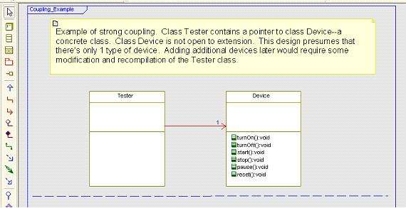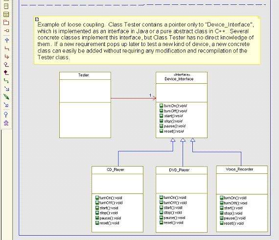 This is a UML diagram illustrating an example of loose coupling between a dependent class and a set of concrete classes, which provide the required behavior: