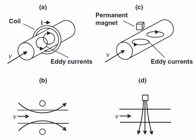 So, when a liquid metal moves across magnetic field lines, the interaction of the magnetic field (which are either produced by a current-carrying coil or by a permanent magnet) with the induced eddy currents leads to a Lorentz force (with density ) which brakes the flow. The Lorentz force density is roughly