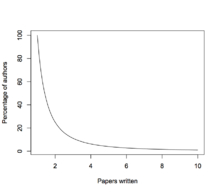 Lotka's law,[1] named after Alfred J. Lotka, is one of a variety of special applications of Zipf's law. It describes the frequency of publication by authors in any given field. It states that the number of authors making contributions in a given period is a fraction of the number making a single contribution, following the formula where a nearly always equals two, i.e., an approximate inverse-square law, where the number of authors publishing a certain number of articles is a fixed ratio to the number of authors publishing a single article. As the number of articles published increases, authors producing that many publications become less frequent. There are 1/4 as many authors publishing two articles within a specified time period as there are single-publication authors, 1/9 as many publishing three articles, 1/16 as many publishing four articles, etc. Though the law itself covers many disciplines, the actual ratios involved (as a function of 'a') are discipline-specific.