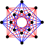 ![]() This graph shows the two alternated polygons as a compound in red and blue 3{3}3 in dual positions. |