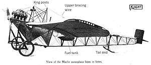 The Macfie monoplane was a British shoulder wing, tractor monoplane. The aircraft was powered by a 35 hp (26 kW) J.A.P. V8 engine fixed at the front of an open-frame 'fuselage', at the rear end of which a tailplane and vertical rudder were mounted.[1]