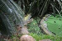 The bank is home to 14 species of the 23 crocodilian species living across the world, two of which are listed by the IUCN as critically endangered and three more as threatened. The 14 crocodile species available in the bank are mugger (Crocodylus palustris), salt-water crocodile (Crocodylus porosus), gharial (Gavialis gangeticus), tomistoma (Tomistoma schlegelii), American alligator (Alligator mississippiensis), Morelet's crocodile (Crocodylus Moreletii), spectacled caiman (Caiman crocodilus), West African dwarf crocodile (Osteolaemus tetraspis), Australian fresh water crocodile (Crocodylus Johnsoni), African slender-snouted crocodile (Mecistops cataphractus), dwarf caiman (Paleosuchus palpebrosus), yacare caiman (Caiman yacare), Nile crocodile (Crocodylus niloticus) and the endangered Siamese crocodile (Crocodylus siamensis).[45][46] The bank currently houses over 2,400 crocodiles and also many species of turtles, snakes, and lizards which are viewable by the public. The bank houses 12 endangered species of turtles and tortoises and 5 species of snakes, including king cobra (Ophiophagus hannah), Asian water monitors (Varanus salvator salvator), two species of pythons, and albino cobras.[47][48] Of the 5,000 reptiles bred at the bank, 3,000 represent the native Indian species Crocodylus palustris, known as muggers. One of the biggest attractions of the park is a fierce salt-water crocodile known as Jaws III. This species, believed to be the biggest in southern Asia,[49] is 17 feet (5.2 m) long and weighs over a ton. The bank is also going to get four new species of crocodiles. These are black caimans, smooth-fronted caimans, Cuban crocodiles and broad-snouted caimans. Anacondas will also appear at the bank. Since April, 2016 four Komodo dragons - three male, one female - have been added to the list of exhibits. The dragons were acquired from Bronx Zoo in New York.
