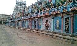 The temple is also famous historically for devadasi tradition, which involves donating dance women to the temple during the medieval period.[6] The inscriptions indicate the tradition, dances, rearrangement during festivals and procession of deities during festivals.[6] The record is dated in the seventh regnal year of Vikrama Chola (1118-35 CE).[13] There are five inscriptions in this vein from the 10th century and there are three later inscriptions date 1123 CE, 1142 CE and 1218 CE. The possible reasoning for the hundred-year gap indicates the shifting of all temple women to Brihadeeswarar temple by Rajaraja I.[14] Since the temple received lot of gifts, the Cholas deputed a special army to protect the endowments.[15]