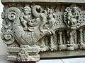 In Hindu iconography, Makara is represented as the vahana ('vehicle') of Ganga, the river goddess. A row of makara may run along the wall of a Hindu temple, act as the hand rail of a staircase, or form an arch above a doorway.[3]