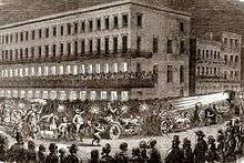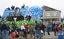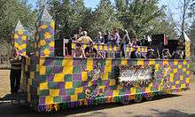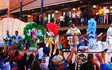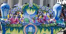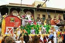 Mobile first celebrated Carnival in 1703 when French settlers began the festivities at the Old Mobile Site.[10] Mobile's first Carnival society was organized in 1704, when Nicholas Langlois founded Société de Saint Louis.[11] In 1711 it was renamed the Boeuf Gras Society (Fatted Ox Society) (1711–1861).[12] In 1830 Mobile's Cowbellion de Rakin Society was the first formally organized and masked mystic society in the United States to celebrate with a parade.[10][13] The Cowbellions got their start when Michael Krafft, a cotton factor from Pennsylvania, began a parade with participants' carrying rakes, hoes, and cowbells.[13] The "Cowbellions" introduced horse-drawn floats to the parades in 1840 with a parade entitled, "Heathen Gods and Goddesses".[12] The Striker's Independent Society was formed in 1843. It is the oldest surviving mystic society or krewe in the United States.[12]