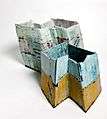 The following pictures show this formative development of the ceramic sculptural objects by Maria Baumgartner: starting from experimenting with circular or cylindrical forms (figure 1), she developed more complicated objects, using thin-walled wavelike shapes with experimental glazes (figure 2), or more solid houselike structures with straight angles (figures 3, 4). Now her objects are a free combination of various geometric shapes and conceptional graphics (figure 5)
