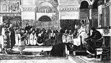 Religious and historical scenes are often presented in medieval architectural setting, usually also related to Alt Garrotxa;[100] it is reproduced with competent attention to detail,[101] though at times also with some creativity.[102] Historical paintings, tending to be academic in style, often reveal a sophisticated factual context;[103] they tend to focus on medieval history of Spain,[104] however initially Vayreda painted works also related to the Third Carlist War.[105] Religious works,[106] usually designed for private use[107] or for local sanctuaries,[108] reveal references – at times bordering quotations – to Italian Quattrocento;[109] contemporaries valued them for color and chiaroscuro refinement,[110] today they are appreciated for composition and context.[111]