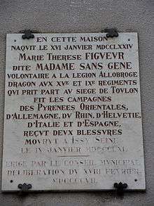 Marie-Thérèse Figueur (Talmay, 17 January 1774 – Paris, hospice des Petits Ménages, 4 January 1861), known by the nom de guerre Sans-Gêne (literally "unconstrained"), was a French heroine who fought in the French Revolutionary Wars and Napoleonic Wars. In contrast with most female soldiers before the twentieth century, she did not disguise her gender when she enlisted, serving for twenty-two years under her own name in the French Revolutionary Army and the Grande Armée.