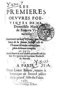 The biographical information concerning Marie de Romieu is scarce at best. She had a brother, Jacques de Romieu, also a poet, who was her publisher and mentor. French author and archivist Auguste Le Sourd claims the family was composed of bakers in Viviers, although this account is widely disputed due to Marie’s level of education.[2] Another theory places both Marie and Jacques in the entourage of their supposed beneficiary, Jean de Chastellier, the finance minister for kings Charles IX and Henry III. In her poems, she mentions a son and the press of certain domestic duties,[2] thus implying that she was married, and had at least one son . Her poems also reveal that she wanted to be a full-time writer and scholar; the preface of her poetic collection states that she wrote it in great haste, because she had no free time due to her household duties.[3]